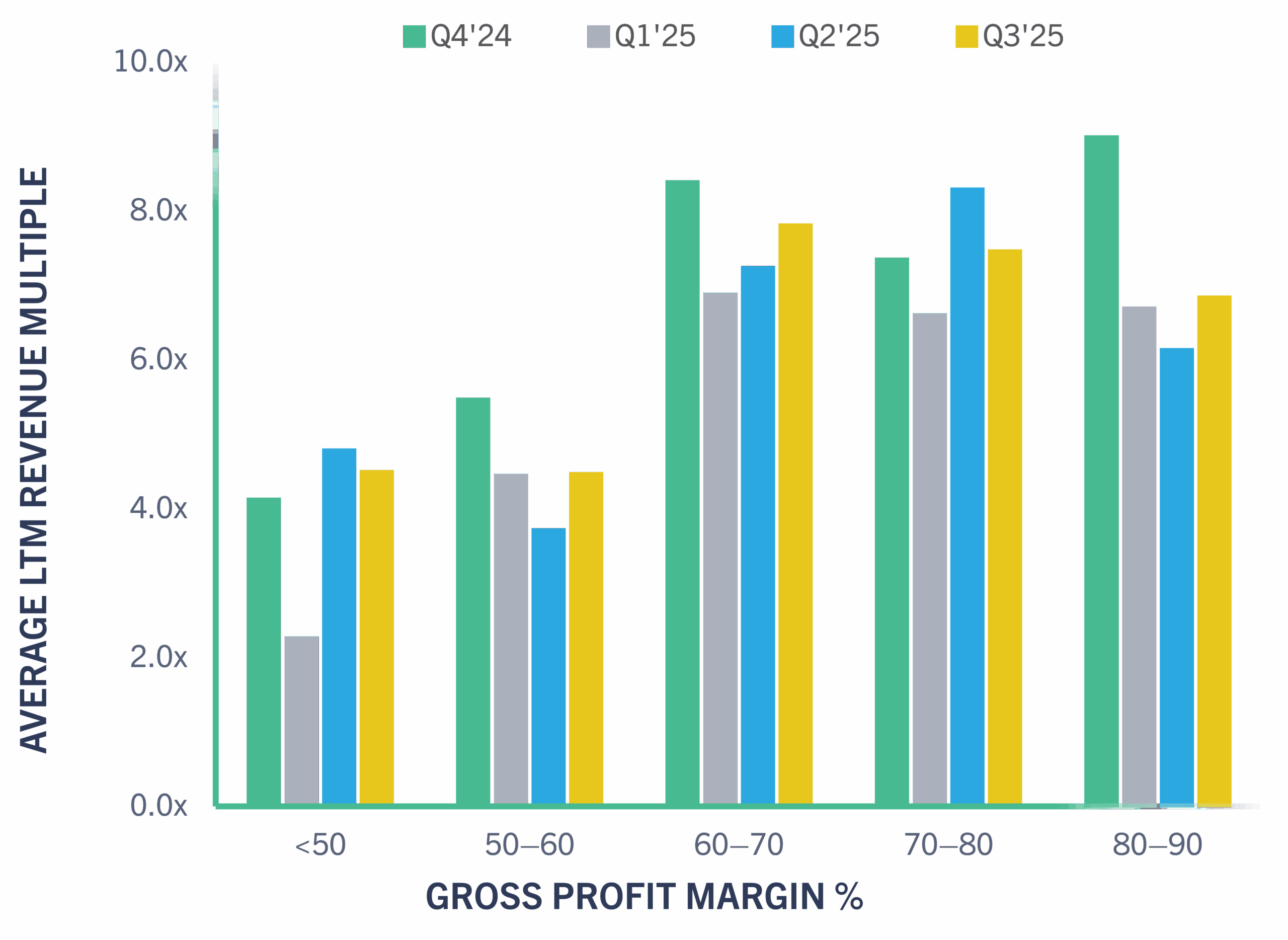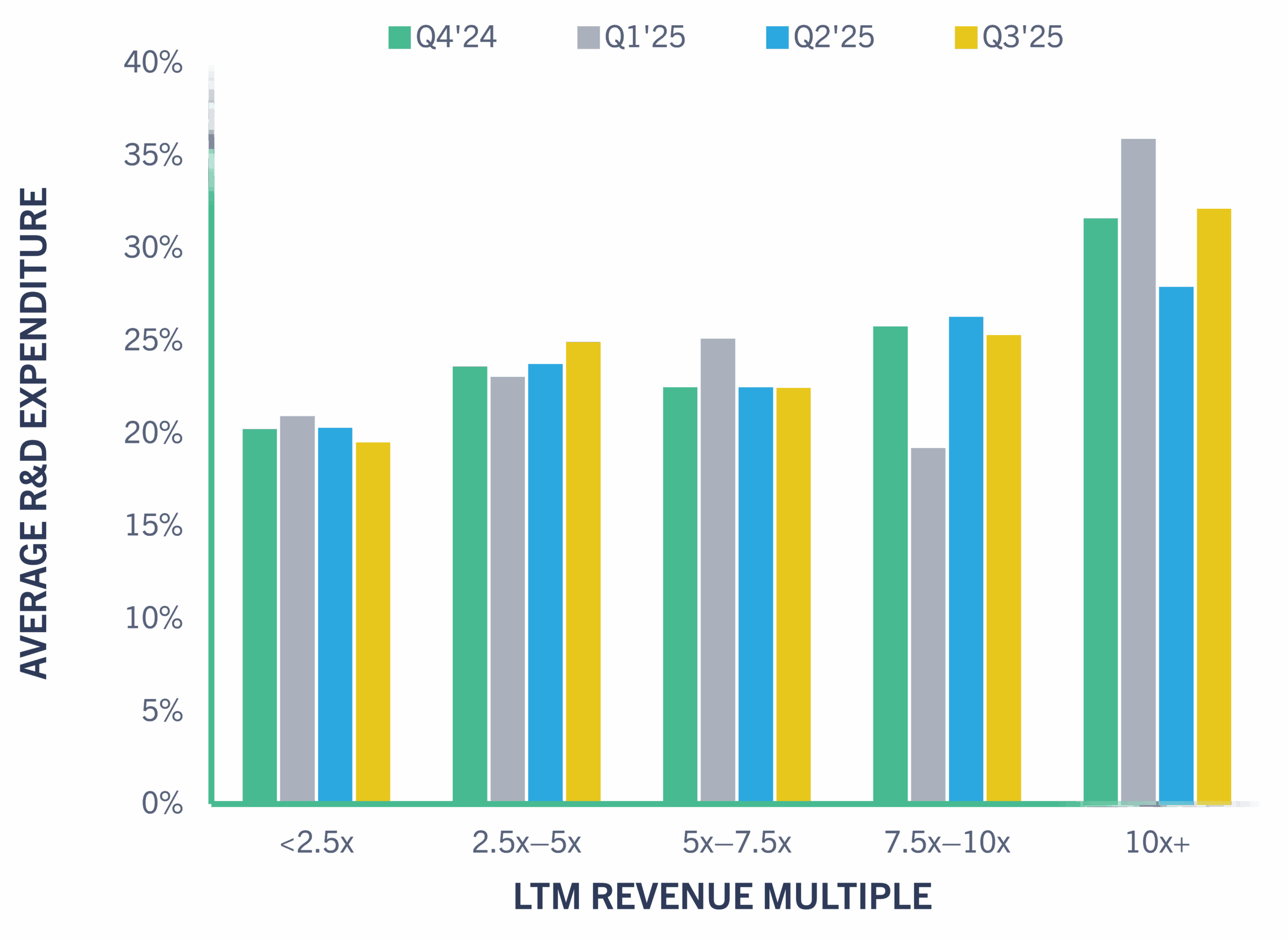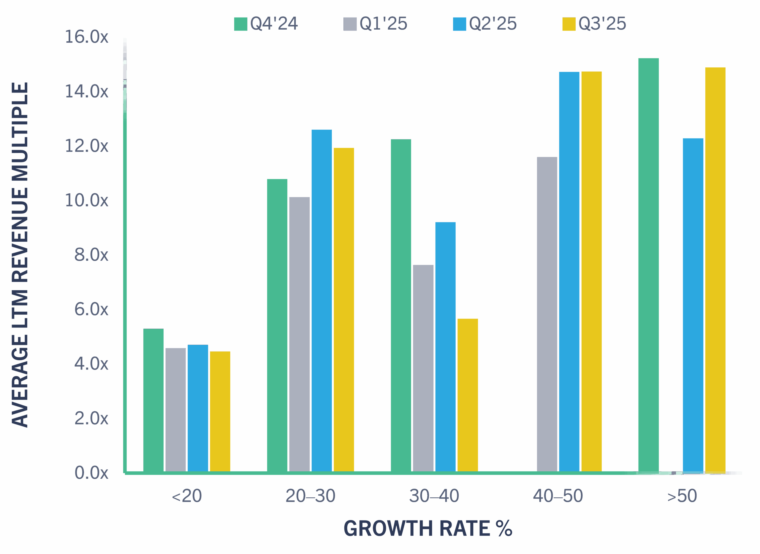 Public and private SaaS revenue multiples have remained consistent to slightly below Q2’25 levels (12.8x vs. 12.1x weighted average LTM Revenue multiple). While optimism around a late-September Fed rate cut provided some tailwinds, persistent uncertainty around inflation and macro growth tempered valuation expansion.
